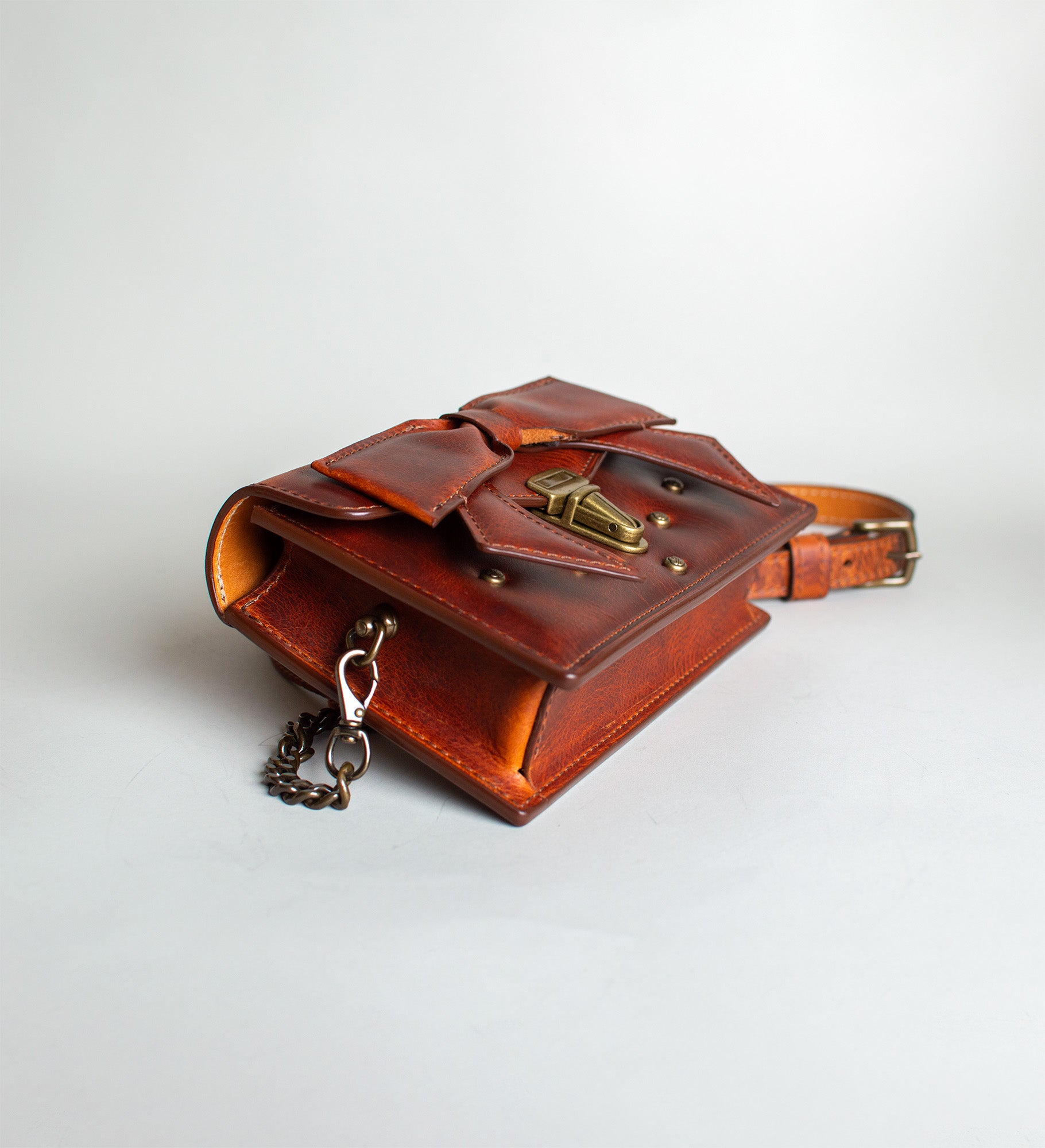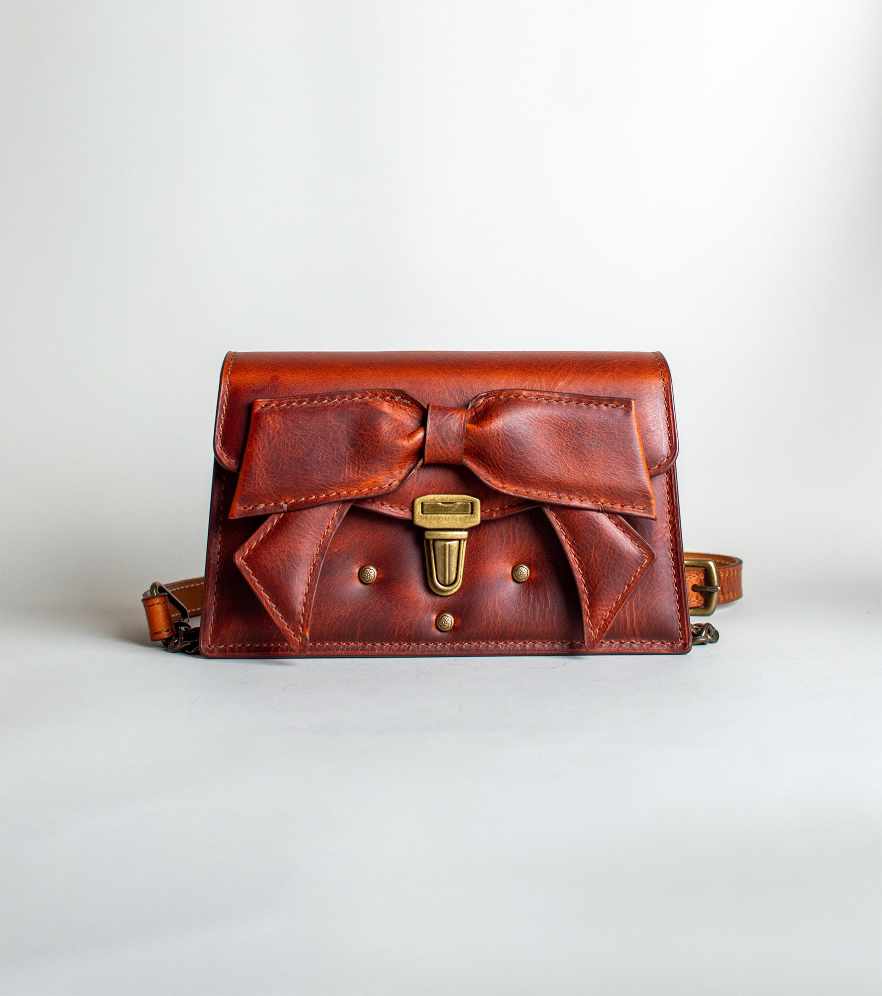 The leather featured is a luscious cowhide from Tuscany, tanned with waxes and oils producing a satin slightly textured look that will develop a beautiful patina with age. The stiffer temper works very well with the structured architecture and the origami bow so it can hold its shape.