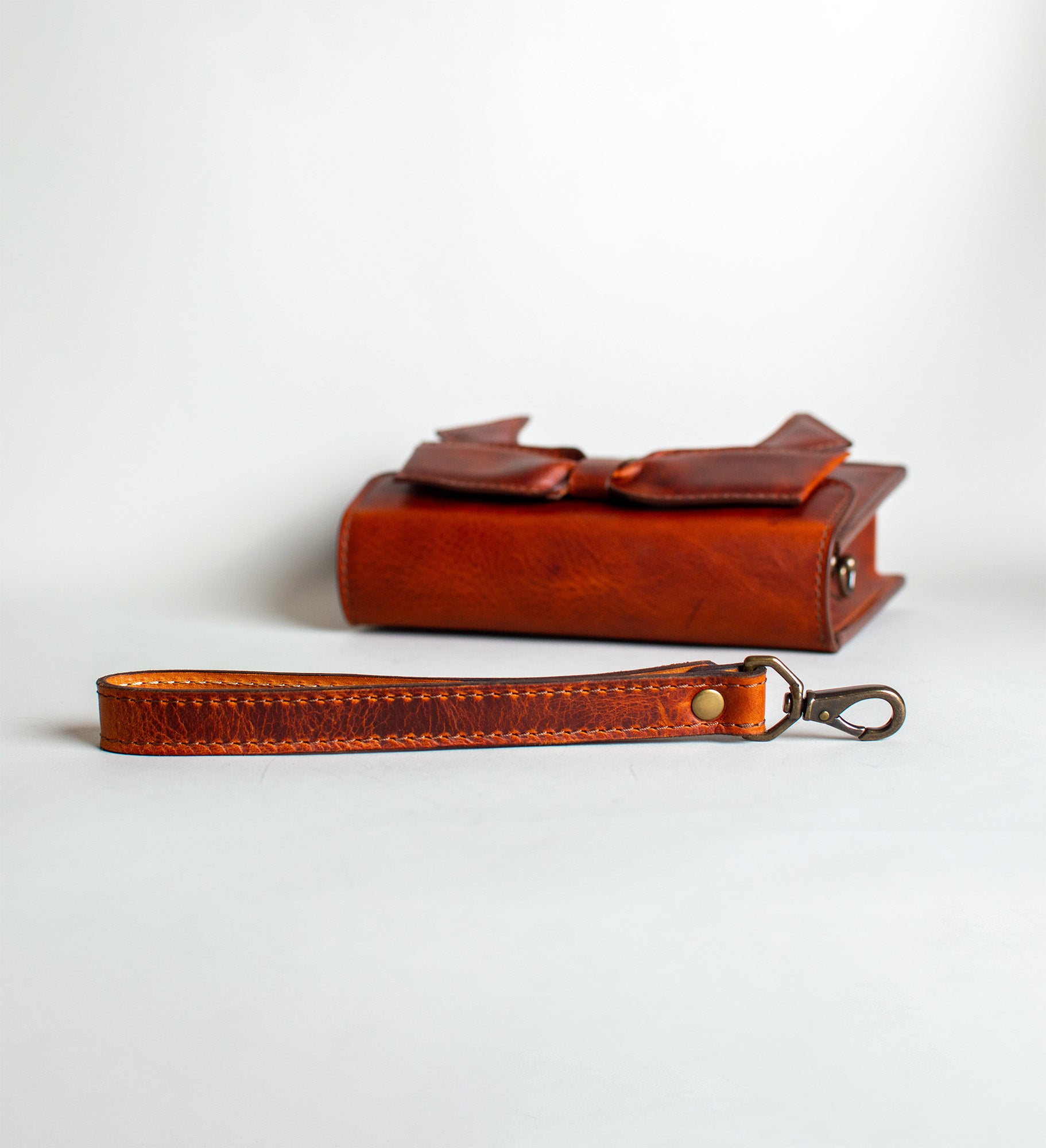 Autumn is inspired by the beautiful colors our trees gain when the leaves begin to fall. The beautiful rich amber color of the leather pops even more with the addition of the folded bow.